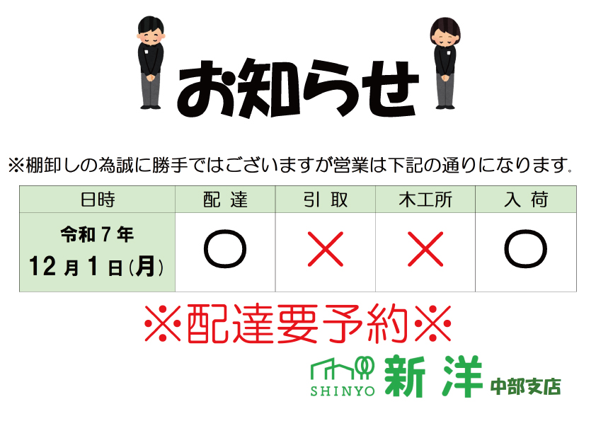 【中部支店】12/1(月)の営業につきまして