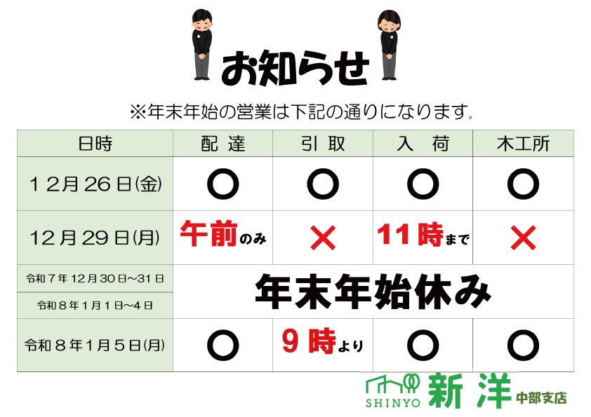 誠に勝手ながら、弊社では以下の期間を年末年始の休業とさせていただきます。
